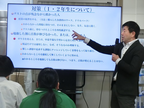 23日(火曜)には冬休み前全校集会が行われました。学習担当からは、先日行われた南浜中学校卒業生講演会の言葉を引用し「苦手は伸びしろ」「学習できる環境づくりの大切さ」などについて、生活担当からは「安心・安全を最優先に」「家族との時間を大切に」との話がありました。校長講話では『やればできる、伸びる南中生、あとはやろうとする気持ち一つ』というタイトルで、4月からこれまでの学習への取り組みの変化について、各学年の成果や課題を数値に基づきながら分析がありました。