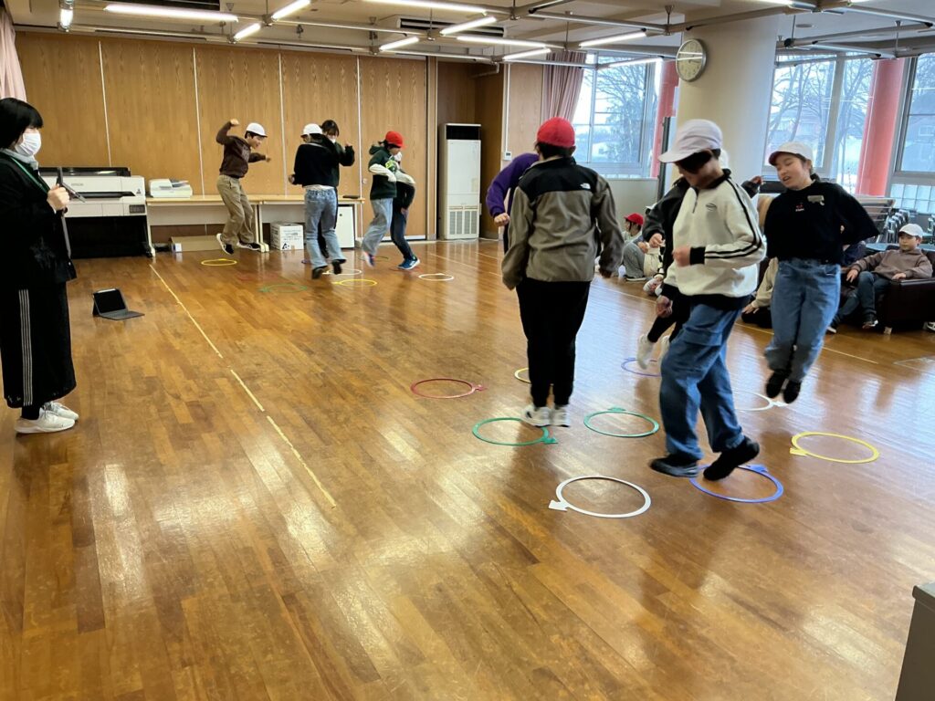 今日は、4年背が6年生と「9ます鬼ごっこ」をして楽しみました。