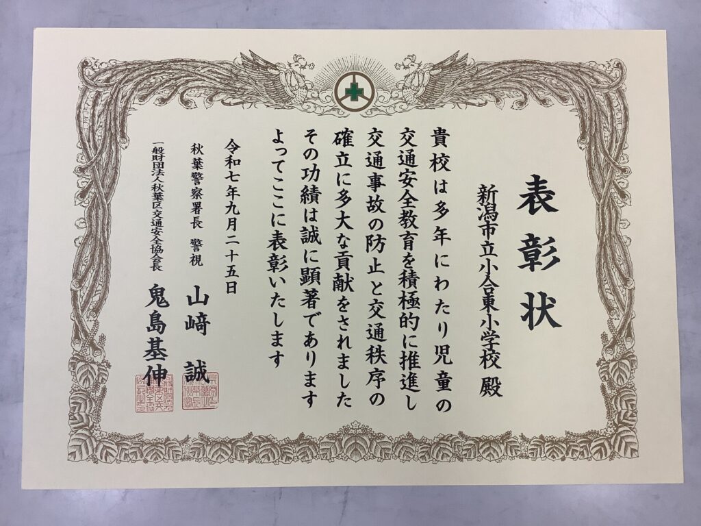 毎年、1年生から3年生まで、交通安全教室を実施しています。このような交通安全教育活動に対して、表彰していただきました。 ありがとうございました!