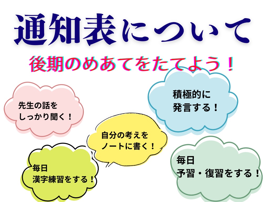 校長講和では、「通知表の丸の数だけを見るのではなく、自分の得意なことや苦手なことを確認して、後期のめあてを立ててください」と話がありました。
