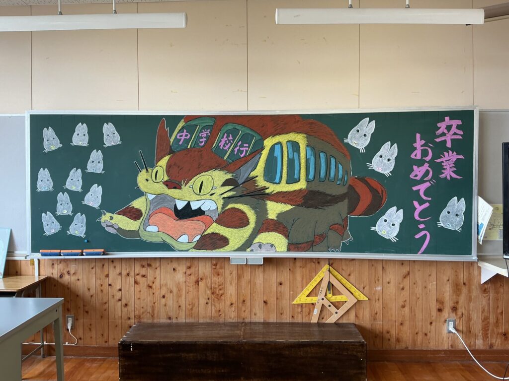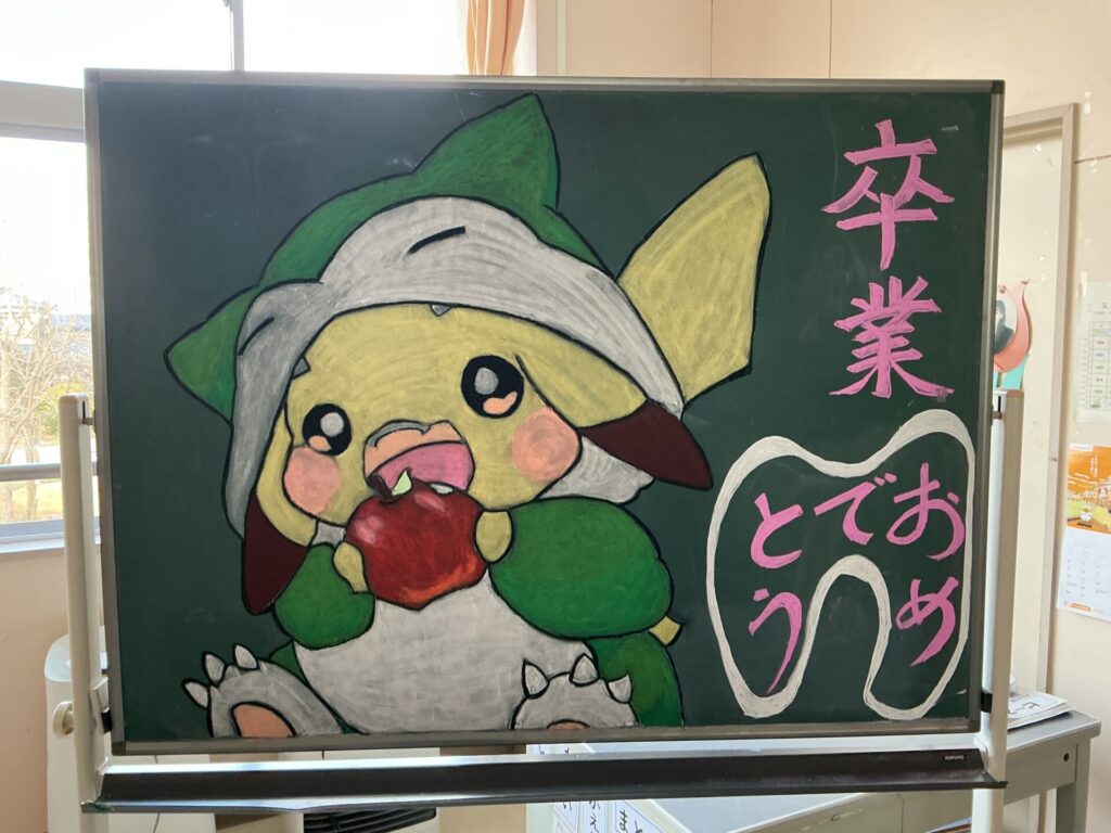 前日準備では、ボラティアの皆様が、教室の黒板にチョークアートを描いてくださいました。