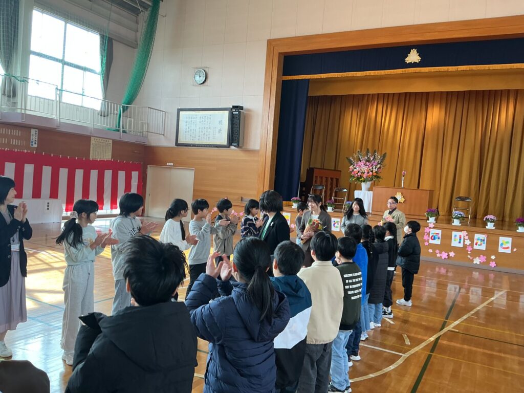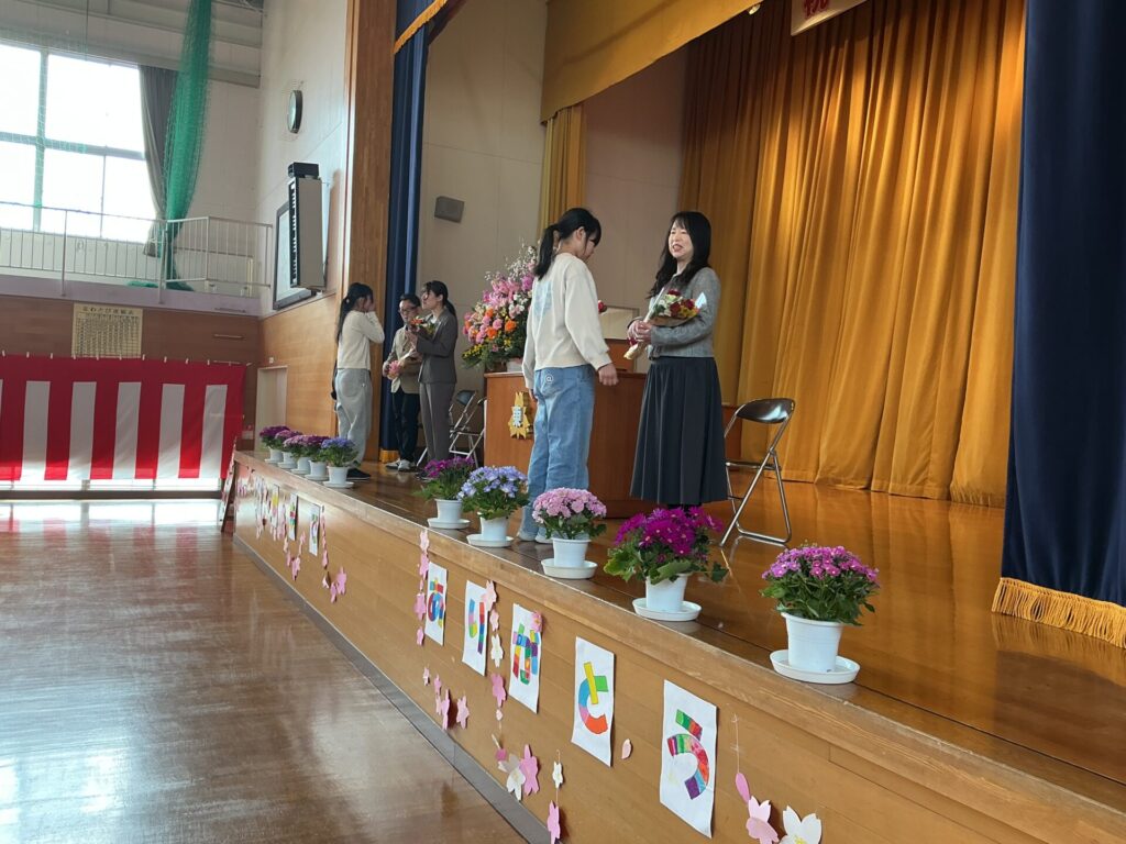 離任式を行いました。この度の人事異動で4名の教職員が転出することとなりました。