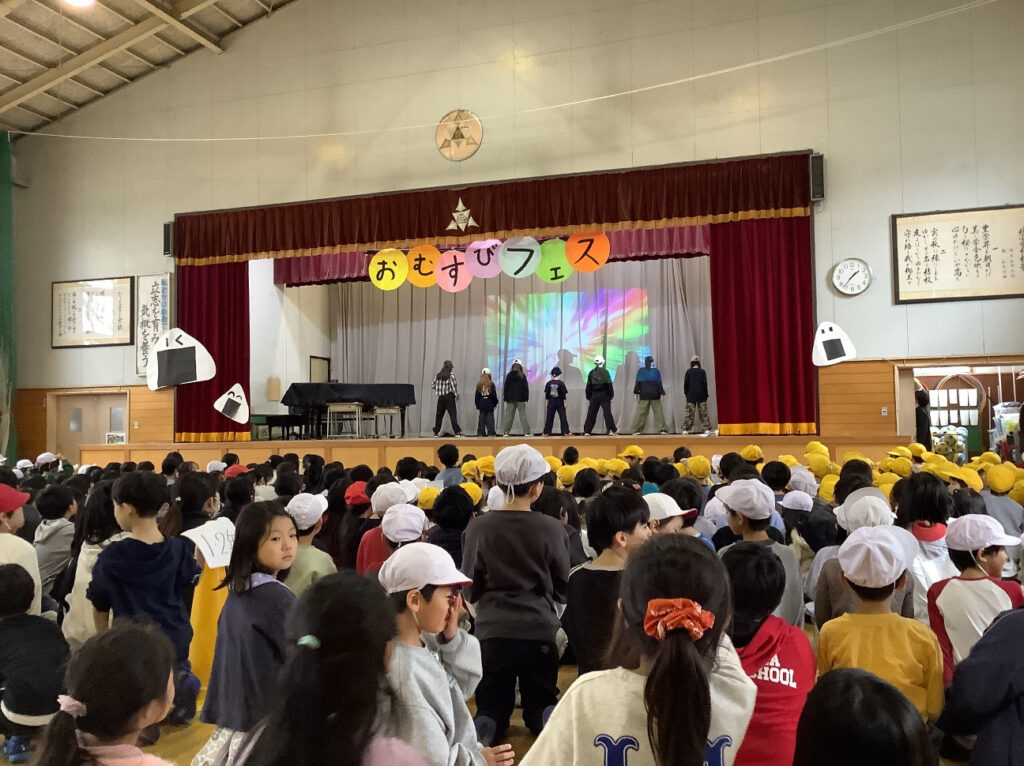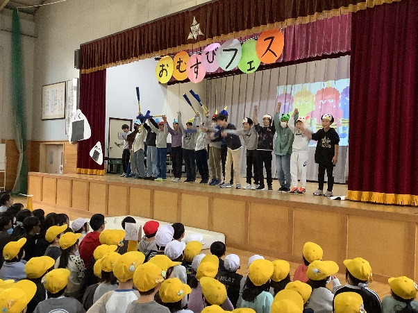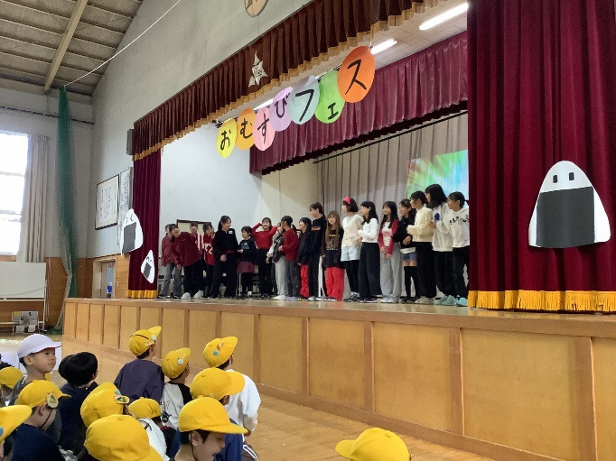 情報集会委員が、昼休みに「おむすびフェス」を開催しました。ダンスやけん玉など、好きなことを好きなように発表するイベントです。6年生からも多くの人が参加し、会場を盛り上げました。先生チームも参加しました。