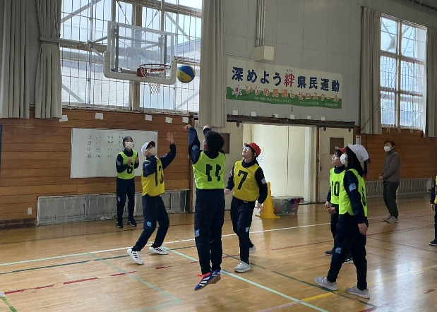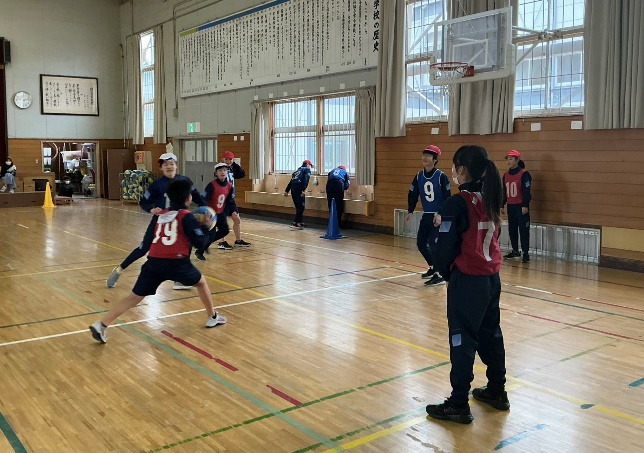 体育でバスケ型ゲームの学習をしています。チームごとに声を掛け合いながら、前向きに取り組んでいます。