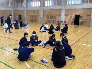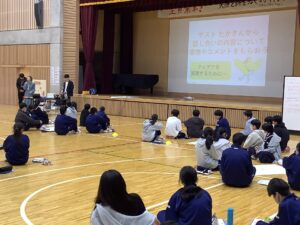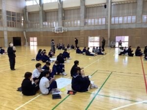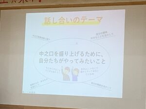 後期中間テスト最終日となるこの日、テスト終了後の3・4限に「生き方講演会」を開催しました。この取組は、西蒲区中学生キャリア教育事業として、例年区内の中学校で行われているものです。NPO法人みらいずworksの皆さんによる進行のもと、ゲストとしてお招きしたNPO法人はざなみき中之口の佐々木 貴生 様が取り組んでおられる「にしかんマルシェ」や「中之口農業体験公園」の活動や、それにかける思いをお話しいただきました。佐々木様は、なか中の卒業生ということで、より一層お話を身近に受け止めることができました。後半は、「中之口を盛り上げるために、自分たちがやってみたいこと」をテーマに、グループで自由にアイデアを交流しました。生徒たちの様々なアイデアが溢れるひと時となりました。