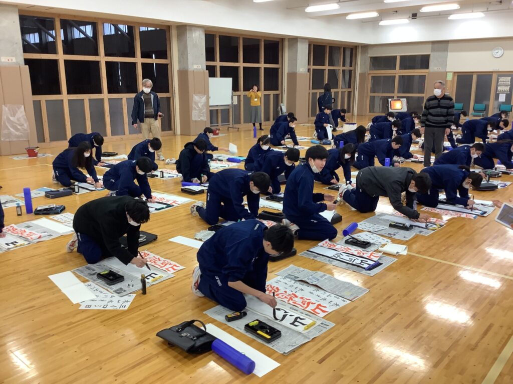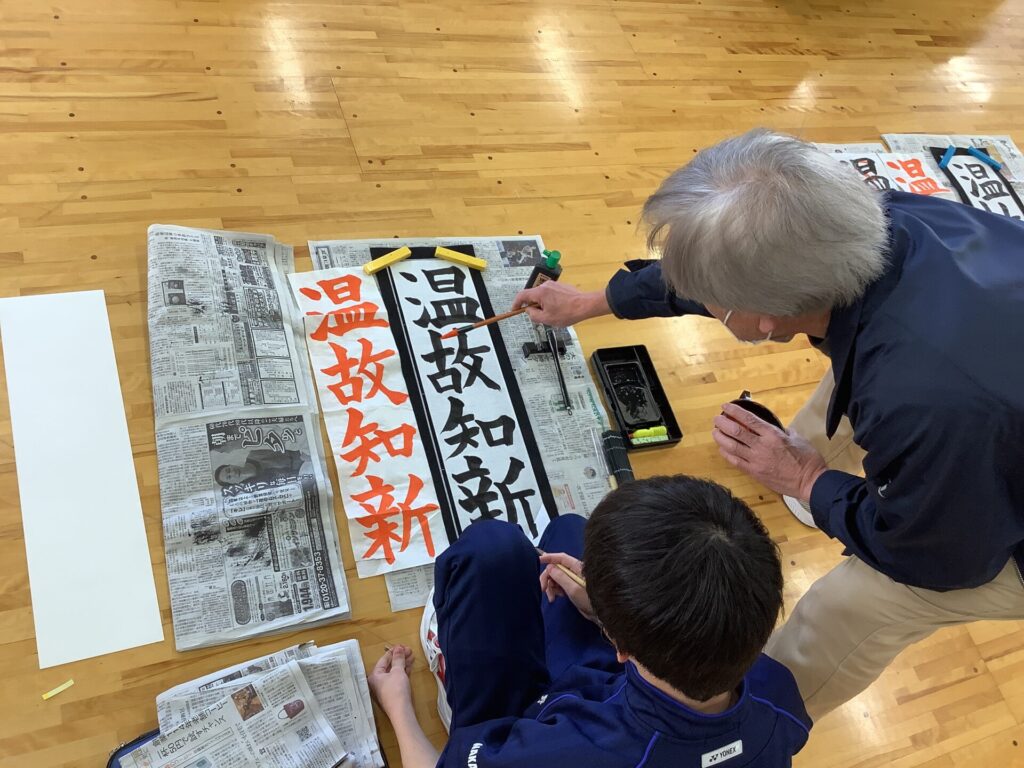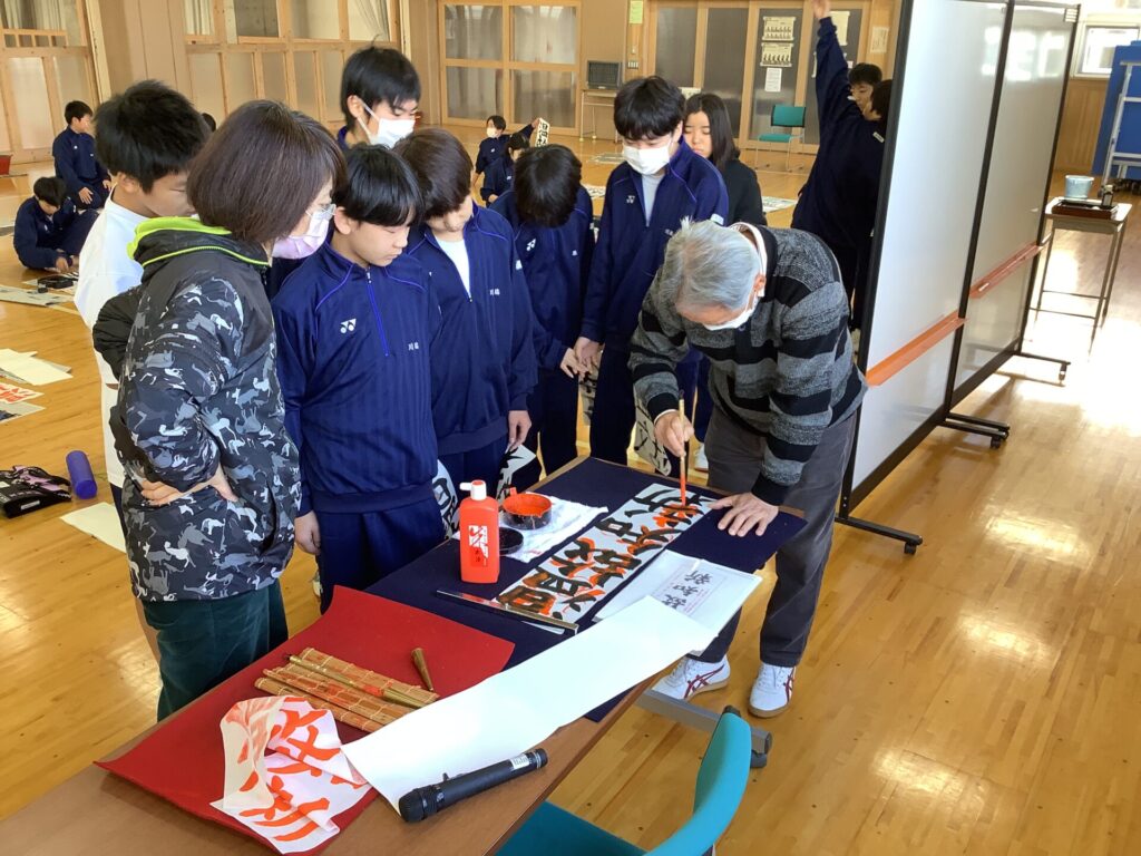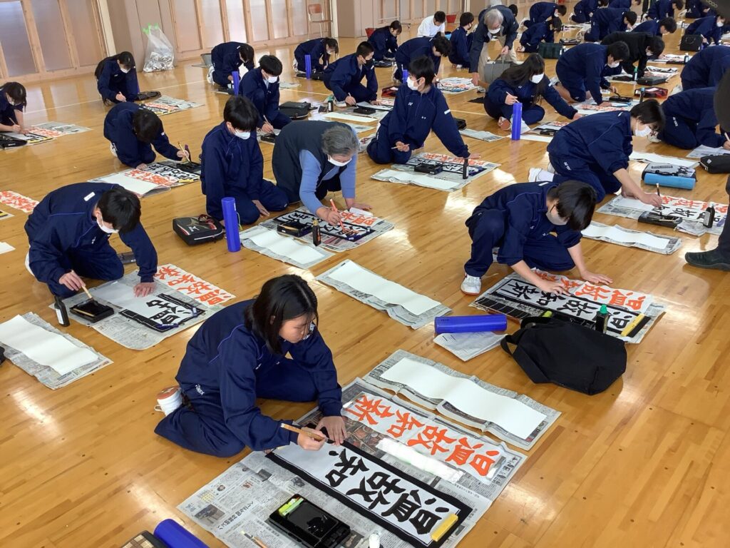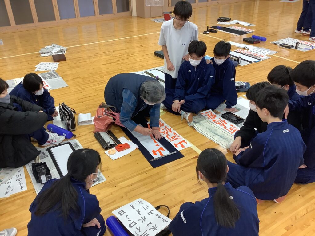 12月10日(水)と11日(木)の2日間にわたって、1・2年生を対象に出前書道教室を行いました。講師には、中之口書道愛好会の皆様をお招きし、朝早くからの活動にもかかわらず、熱心かつ丁寧にご指導をいただきました。1年生は楷書での「温故知新」、2年生は行書での「山河悠然」という課題です。一人一人が筆の流れ、止めやハネ、文字のバランス等に気をつけて、工夫しながら取り組んでいる様子が伝わってきました。講師の皆様からも、「上手な生徒が多く、みんな頑張ってくれていました。」とお褒めの言葉をいただきました。ご指導ありがとうございました。今日の成果を生かし、多くの生徒が新年恒例の地域行事である「書き初め大会」に参加してくれることを期待しています。