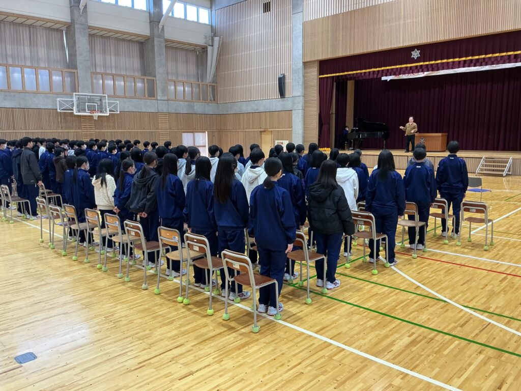 本日4限に行った卒業式練習は、現在3年生が学年閉鎖のため1・2年生のみで行いました。座り方や礼の仕方等の確認、式歌練習など、卒業生への感謝を込めて当日を迎えられるように準備を進めています。