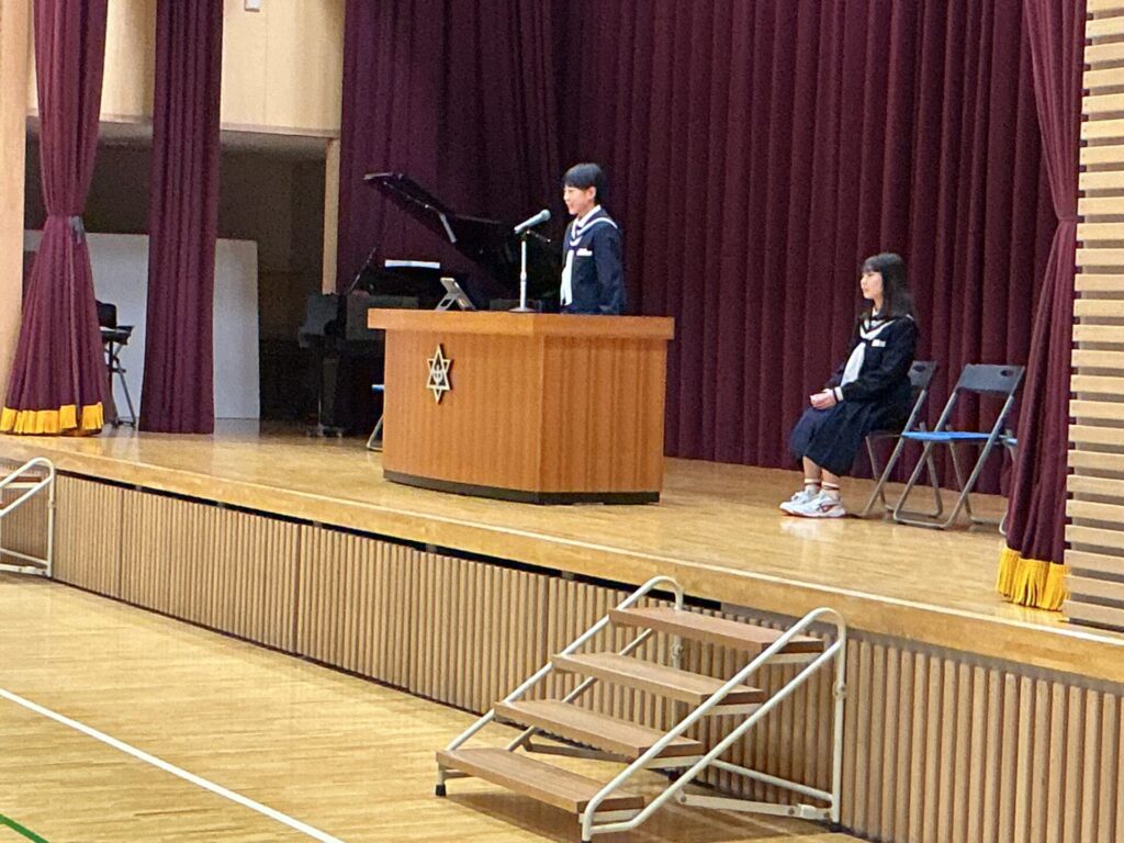 今日から令和8年度が始まりました。新任式では、8名の新任職員の方々をお迎えし、お一人ずつご挨拶いただいた後に、生徒会長から歓迎の言葉が述べられました。続いて行った始業式では、はじめに新2、3年生の代表生徒が新年度の抱負を述べてくれました。昨年度の経験から学んだこと、そこから得た力や自信、そして新年度にかける思いなどが力強く述べられ、大変立派でした。校長先生からは、代表生徒の発表を参考にして、一人一人が抱負や目標をもって新年度をスタートさせてほしいこと、そしてすべての生徒が居心地よく過ごせる学校であるために、思いやりをもって人と関わりながら、自分のよさや持ち味を見つけ、自分らしく過ごしていける学校を、生徒全員の協力で実現してほしいとの願いが伝えられました。最後に、今年度の職員の担当が発表され、生徒からの拍手で会を閉じました。生徒と教職員がお互いに協力し合い、よりよい学校を目指していく気持ちが高まったよい場面でした。午後は第63回入学式を行います。