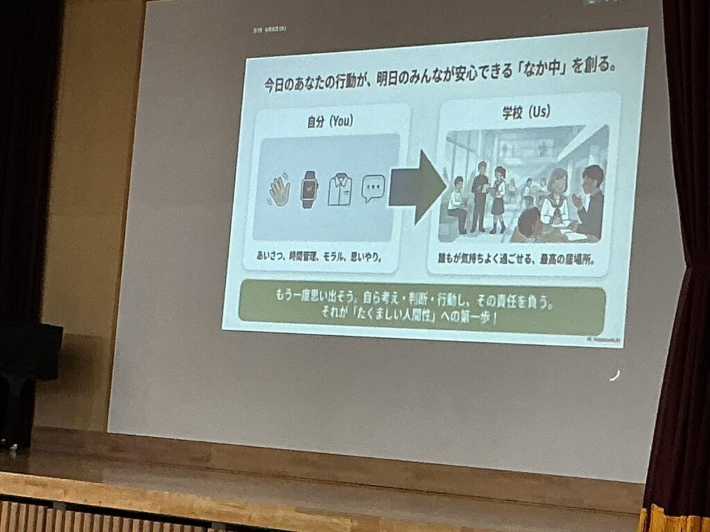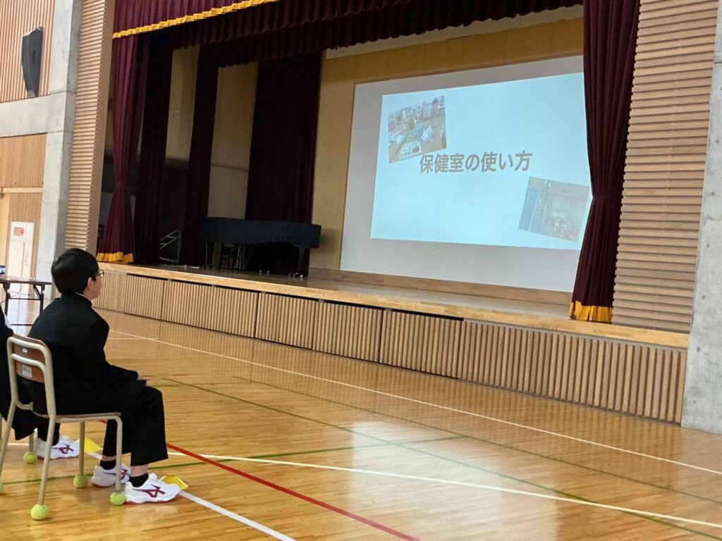 1時間目に全校生徒が集合して、学校生活に関する年度始めのオリエンテーションを行いました。「学習」、「給食」、「生徒指導」、「部活動」、「保健関係」、「iPad使用」について、各担当の先生方から指導がありました。一人一人が意識して実践し、みんなが居心地よく学校生活を過ごせるようにしましょう!
