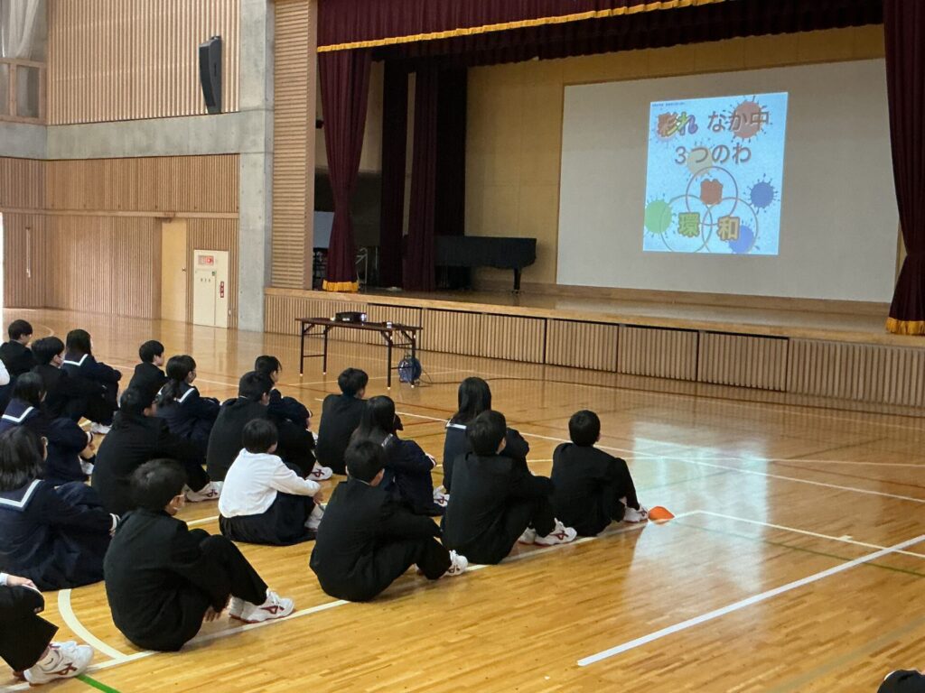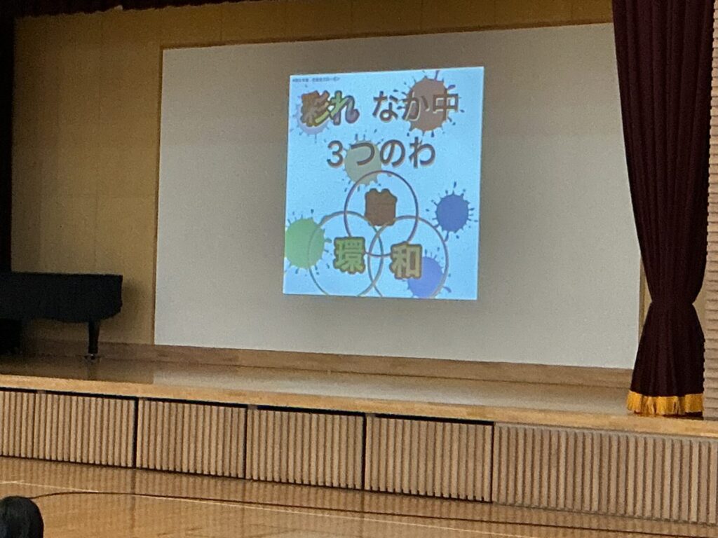 今年度初めての生徒朝会では、今年度の生徒会スローガン【〜彩れ、なか中! 3つのわ(和・輪・環)〜】が発表されました。「彩れ、なか中」には、自分たちの行動で、なか中をよりよく、学校生活を充実させていこうとする思いが、そして、ひとりひとりの行動や思いが集まることで、学校生活をより豊かに彩ろうという思いが込められています。「和」には、思いやり・仲のよさ・支え合い・お互いを大切に、安心できるように、との思いが込められています。「輪」には、仲間とのつながり、学級や学年をこえて、いろいろな人と関わっていけるようにとの意味が、そして「環」は、活動や交流の広がりを表し、学校全体から地域へと活動と思いを広げていけるように、PDCAサイクルによって、実行するだけでは終わらせずに振り返りと改善を進めていくことを意味しています。このスローガンのもと、充実した活動が展開されることを期待します。