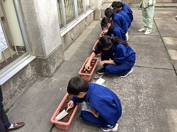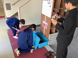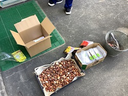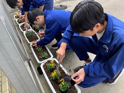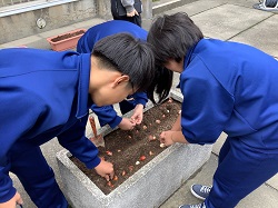 ・学年委員会の呼びかけで集まった生徒たちと一緒に、中庭や玄関前のプランターにチューリップの球根を植えました。今年の春に咲いた花から収穫した球根も使い、たくさんの球根を丁寧に植え付けました。