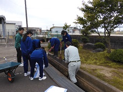 ・PTA活動の一環として、校舎敷地内の側溝清掃を行いました。昨年は雨天のため中止となり、今回は2年ぶりの実施となりました。当日は、全校生徒に加え、多くの保護者の皆さまにもご参加いただき、無事に作業を終えることができました。特に側溝のふたの取り外しや泥の掻き出しなど、力仕事が必要な場面ではPTAの皆さまのご協力が欠かせませんでした。