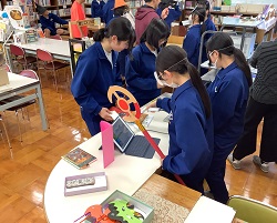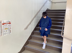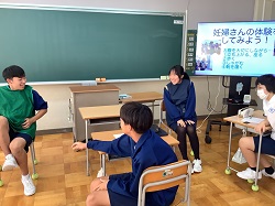 ※妊婦ジャケットを着て、しゃがんだり階段を上り下りしたり、床に置いてある物を拾ってみたりと、妊婦さんの日常動作を体験しました。普段は何気なくできる動作が、妊婦さんにとってはとても大変なことだと生徒たちは実感することができました。