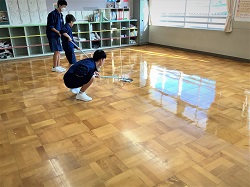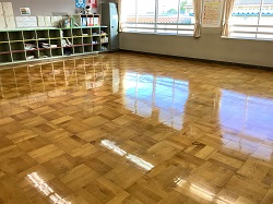 ※ワックスがけが終わった教室の床は、見違えるほどきれいに!光沢のある床に、みんなの頑張りがしっかりと表れていました。