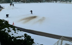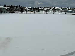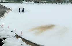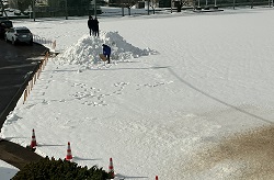 ・先週末の寒波で、一気に冬らしい景色になりました。日中でも気温は5℃を下回り、夜には零下の冷え込みに。グラウンドは一夜にして真っ白な雪に包まれました。※除雪で出来た雪山で遊んでいる生徒の様子
