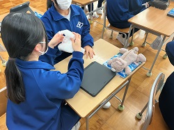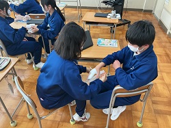 ・保健体育の授業では、けがをした際に落ち着いて対応できるよう、応急処置について学習しました。今回は「指を骨折した場合の固定方法」をテーマに、ペアで包帯を使った演習を行いました。本来なら痛みを伴う場面ですが、今回は練習。それでも生徒たちは「もし本当に痛かったらどうしてほしいか」を考えながら、丁寧に包帯を巻いていました。教室には仲間を大切にする温かな配慮が感じられました。応急処置の技術だけでなく、仲間を思いやる気持ちも育つ、学びの時間になりました。