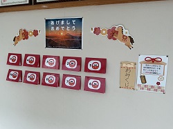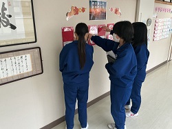 ・保健室前の掲示板に、気運を高める「けんこうおみくじ」が登場しました!。新年のめでたい雰囲気にぴったりのおみくじで、くじを引いて番号のカードをめくると、健康のヒントや気持ちが明るくなるメッセージが書かれています。久しぶりの学校生活が始まった廊下では、さっそくおみくじを楽しむ姿が見られました。※くじを引きます。