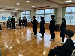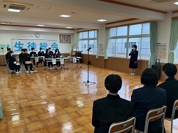 ・2回目の総会は、今年度の活動を振り返りながら、各学級で出された質問や意見について活発な討議が行われました。生徒一人ひとりが学校生活をより良くするために真剣に向き合う姿が印象的でした。総会終了後には、現役員から新役員への引継ぎ式が行われました。大切な資料や委員会ならではのアイテムが手渡されると共に、先輩からはこれまでの活動への感謝の言葉が、新役員からはこれからの活動への力強い決意が述べられ、温かく引き締まった時間となりました。※現生徒会長:総会では皆さんの積極的な参加が不可欠です。今後の学校生活をよりよいものにするためにも、一人ひとりが意見を出し合い、学校づくりに関わっていきましょう。