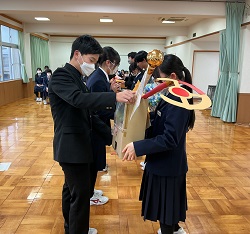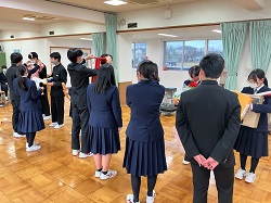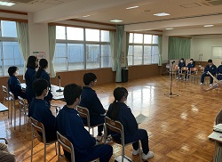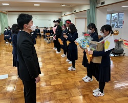 ・新しい年のスタートとなる全校朝会は、人権作文の表彰式から始まりました。普段の表現活動の成果がしっかりと実を結び、受賞者には温かな拍手が送られました。続いて、校長先生と新生徒会三役による新春対談が行われました。校長先生からの質問に対し、三役それぞれが今年の学校生活に向けた抱負を力強く語ってくれました。朝会の最後には、新三役が企画した、全校生徒で楽しめる活動が行われ、会場は明るい雰囲気に包まれました。新しい一年の始まりにふさわしい、素晴らしいスタートを切ることができました!※表彰式の様子