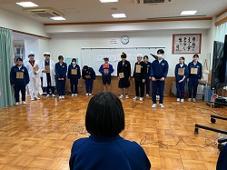 ・卒業式を間近に控え、3年生にとっては今回が最後の全校朝会となりました。朝会の冒頭では、ソフトテニス大会で入賞した生徒の表彰が行われ、地域移行の中でも生徒たちが活躍している姿が紹介されました。続いて、校長先生からR7年度の振り返りと今後の展望についてお話がありました。特に、小中学校の連携について触れられ、学校・地域行事や防災面で協力しながら取り組みを進めていくことの大切さが語られました。※インドアソフトテニス大会の表彰