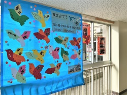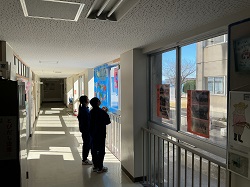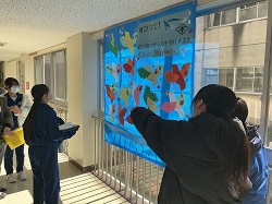 ・通路南側の窓に、卒業を間近に控えた3年生の決意や成長の証を記したタペストリーが飾られています。一人ひとりのメッセージは、未来へはばたく姿をイメージした鳥形の用紙に書かれ、青空を背景にしたブルーシートに貼り付けられています。日差しが差し込むと、鳥たちが空へ飛び立っていくように見え、卒業生の門出を見守るように後押ししてくれる展示になりました。