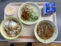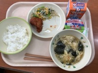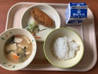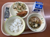・ごはん ・豚汁 ・こいわしのフライ ・大豆の磯煮 ・牛乳 いわしは漢字で「魚」へんに「弱」と書きます。陸に上がるとすぐに弱ってしまうことから「よわし」と呼ばれ、それがだんだん「いわし」に変化したともいわれています。いわしは昔から庶民の味として親しまれ、日本各地に郷土料理があります。また、世界中でも世く食べられている魚で、フランス、イタリア、スペイン料理もいわしを使ったものが多くあります。