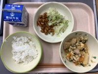 ・ごはん ・高野豆腐入り親子煮 ・鉄火みそ ・たくあん和え ・牛乳 高野豆腐(こうやどうふ)は、とうふを凍らせて、乾燥させた食べ物です。昔、お寺では、肉や魚を食べずに、とうふなどを食べていました。冬の寒い時期に、外に出しておいたとうふが凍って、ぐうぜん生まれた食べ物だといわれています。江戸時代に、和歌山県の高野山にあるお寺の名物になっていたことから、高野豆腐(こうやどうふ)という名前がつきました。
