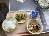 ・ごはん ・だいこんのオイスターソース煮 ・揚げぎょうざ ・もやしのナムル ・牛乳 今日の煮物に入っているあつあげは、とうふの水気を切ってから、油であげたものです。中はとうふのように白いので、生あげともいいます。 とうふも栄養が豊富な食品ですが、あつあげはとうふの栄養がさらにギュッとつまった食品です。同じ量のとうふと比べると、油であげてあるのでエネルギーが高くなります。カルシウムや鉄分は約3倍、たんぱく質は約2倍になります。あつあげに変身すると栄養が増えるなんてすごいですね。