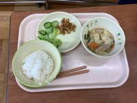 ・ごはん ・みそワンタンスープ ・大豆と鶏肉のごまがらめ ・塩もみ ・牛乳 だいずが中国から伝わってから2000年、今では日本人にとってなくてはならない食材になっています。 だいずにはとてもたくさんの栄養があることはみなさんも知っていると思いますが、そのまま食べると消化吸収されにくいため、昔の人は少しでも栄養を体に取り入れようと、とうふなどのやわらかい大豆の加工品を生み出してきました。でも、よくかんで食べることもたいせつです。今日の大豆も消化がよくなるようによくかんで食べてほしいと思います。