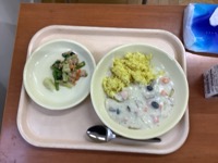 ・カレー味ごはん ・サーモンのクリームソース ・アーモンド入りこまツナサラダ ・コーヒー牛乳 アーモンドなどのナッツ類は、植物の実ではなく種の部分です。ですから新しい芽を育てるための必要な栄養分をたくさんもっています。また、若返りのビタミンと呼ばれる「ビタミンE」もたくさんふくまれています。そのせいか、昔からアーモンドは美しいものをあらわす言葉として使われています。例えば、クレオパトラのような目をを「アーモンド・アイ」健康的なおへその形を「アーモンド・ネーブル」と呼ぶそうです。