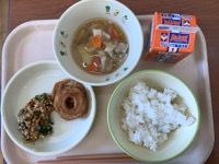 ・ごはん ・地場もん自慢汁 ・車麩の揚げ煮 ・きりざい ・牛乳 今日は、おいしい新潟のお米に合わせて、新潟でとれた食材をたっぷり使った「キラッと新潟米☆じばもんこんだて①」です。新潟ではいろいろな野菜が取れますが、今が旬の野菜をたくさん使ってみそ汁を作りました。くるまふのあげには、くるま麩をもどしてから油であげ、たれにつけた郷土料理です。また、きりざいは中野山小学校でも大人気の魚沼地方の郷土料理ですね。新潟のめぐみをいただきましょう!