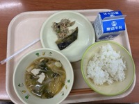 ・ごはん ・白菜のみそ汁 ・ほっけの塩焼き ・炒りおから ・牛乳 おからは、大豆からとうふを作るときにできます。大豆から豆乳をしぼった後の残りがおからですが、大豆と同じようにたんぱく質、カルシウム、食物せんいをとてもたくさん含んでいる食べ物です。白い花のように見えるところから「うのはな」ともよばれます。 カロリーも低く、ダイエットや生活習慣病予防にもおすすめの食べ物です。