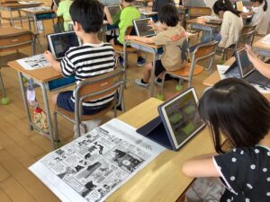昨日の1年生の写真です。 国語の時間の一場面です。新聞記事を担任が読み聞かせをしています。 記事の感想を子どもたちがタブレットに入力しています。新聞記事を通して社会問題に触れるとともに、自分の気持ち …