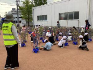 1年生は夏休み前から育てていたアサガオでリースを作りました。ボランティアさんに手伝ってもらいながら立派なリースができました。