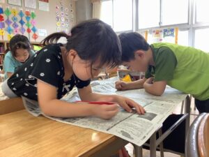 1年生では、新聞を使った「文字集め」の活動を行っています。先生から出された一文字のお題をもとに、ペアで協力しながら新聞の中からその文字を探します。