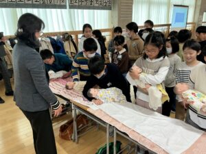 また、赤ちゃんの抱っこの仕方も教えていただき、実際に人形を抱っこする体験をしました。