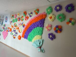 今週は「卒業おめでとう週間」です。 児童玄関には、3年生が作成した大きな桜の木が。 体育館へ続く廊下の壁面には、4年生が作成した大きな花束が。 6年生の卒業をお祝いする雰囲気が校内にあふれています。