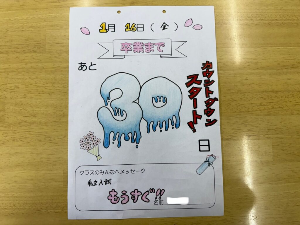 卒業まで…いよいよ残り30日となりました。 3年生では、今日から卒業カウントダウンが始まりました。 一人一枚、カレンダーに思いを込めて記入しました。 毎日めくるたびに中学校生活の「終わり」と「次の一 …