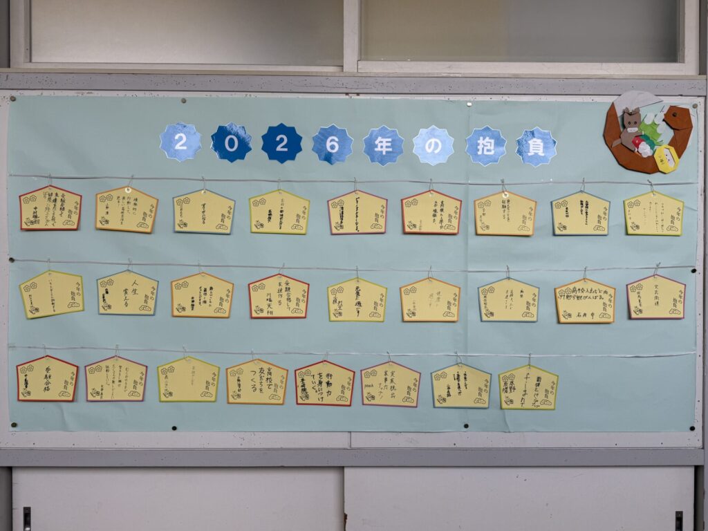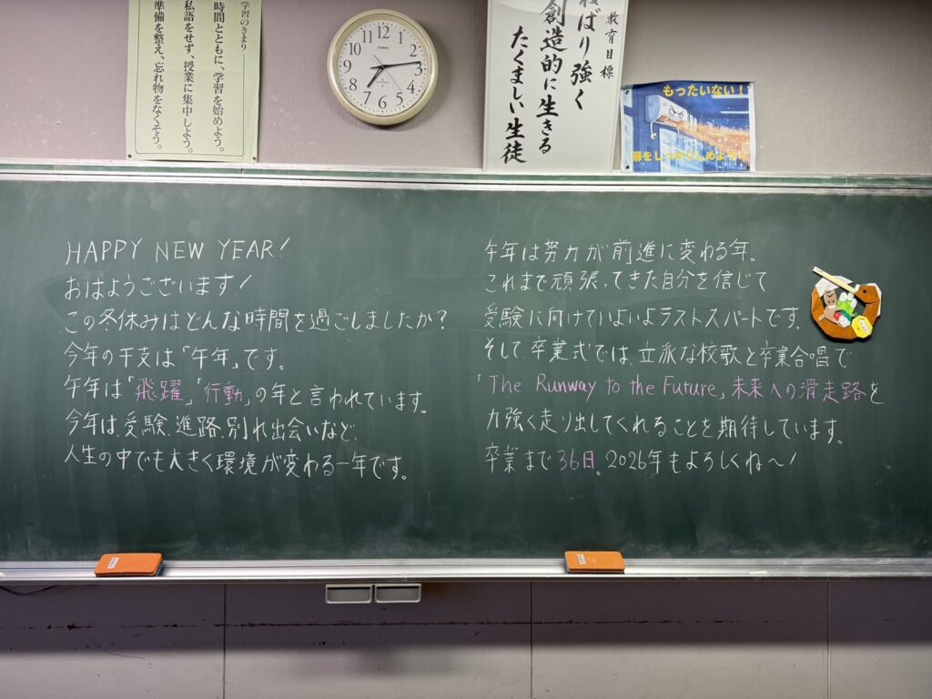 あけましておめでとうございます! 冬休みがあっという間に終わり、1月8日(木)から授業が再開しました。 2026年ということで、今年の抱負をみんなで絵馬に記入しました🐴 「志望校に合格して友達をたくさん作る!」「部活を頑張る!」「勉強を頑張る!」「積極的に行動する!」などの抱負が書かれていました。 今年は、3月に中学校を卒業して4月からは高校に進学し、環境が大きく変化する年です。 まずは、私立入試、公立入試に向けて全力で頑張って欲しいです。頑張れ!3年生!