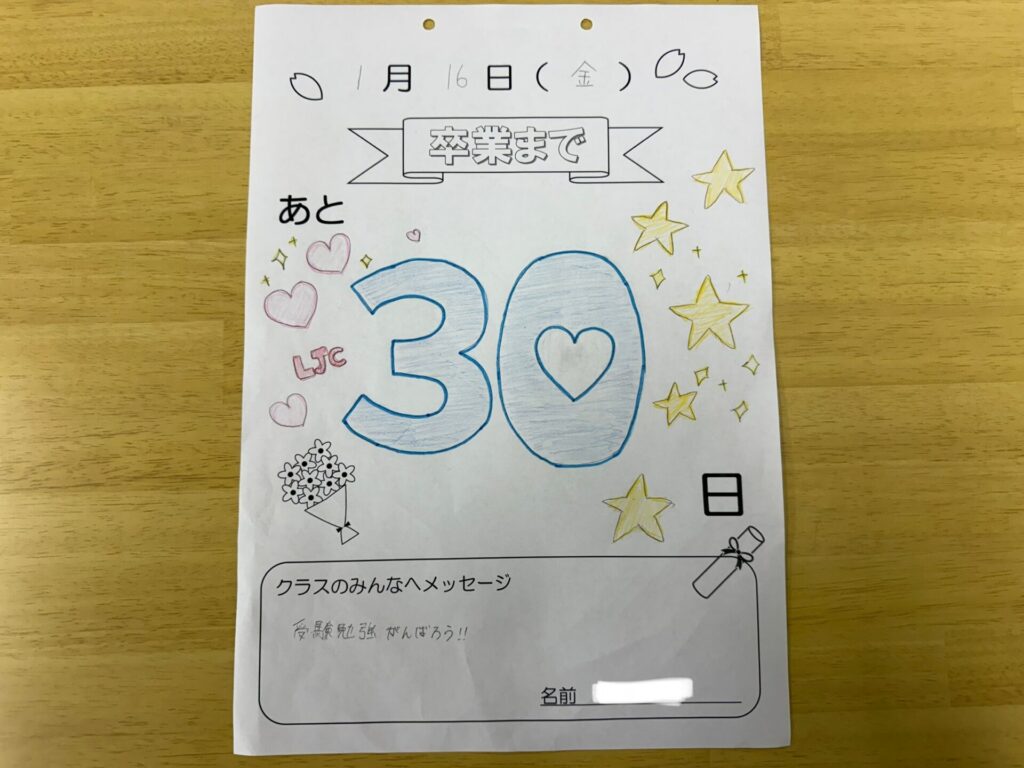 卒業まで…いよいよ残り30日となりました。 3年生では、今日から卒業カウントダウンが始まりました。 一人一枚、カレンダーに思いを込めて記入しました。 毎日めくるたびに中学校生活の「終わり」と「次の一歩」が近づいていきます。 30日はあっという間…まずは来週の私立入試。全力で頑張れ、3年生!!