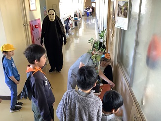 5,6年生の6人が「ハロウィン宝探し」のイベントを企画・開催しました。新飯田小のキャラクター「なし丸」のカードが全校のどこかに隠されました。縦割り班で一斉に探しに行きました。カードは39枚。カードには点数が書かれていて、多くカードを見つければよいという訳ではないという企画です。なぞの「カオナシ」まで登場し、大いに盛り上がったイベントとなりました。