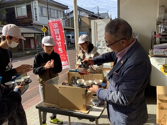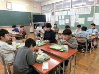 月潟給食センターの方々が当校の給食の時間に合わせ来校されました。配膳・喫食・片付けの様子をご覧になりました。6年生には、栄養教諭から食育指導をしていただきました。机を合わせたり、円になったりして、一緒に会食しました。メニューは、車麩の揚げ煮、里芋の味噌汁、ごぼうの和風ゴマネーズ和え、ごはんと牛乳でした。