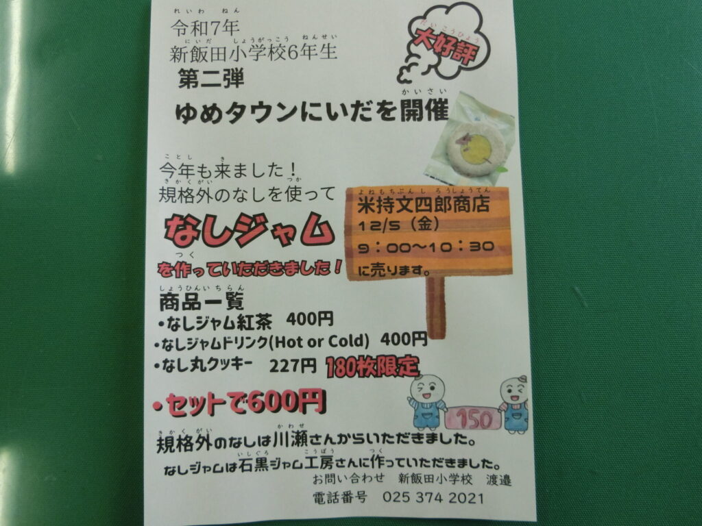 規格外のなしを使ったスイーツの取組の第2弾「なしジャム」を作っていただきました。なし丸クッキーとなしジャムの温かいドリンクをセットで販売します。米持文四郎商店様にご協力いただき、10時30分まで6年生が張り切って活動しています。お近くの方、ご都合がつく方、足元が悪いですが、ぜひ行ってみてください。