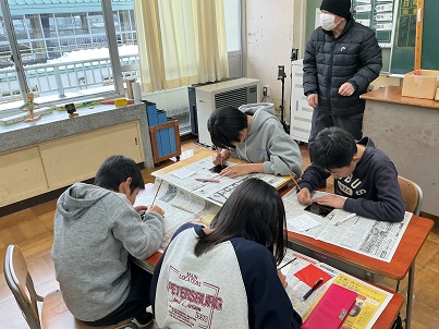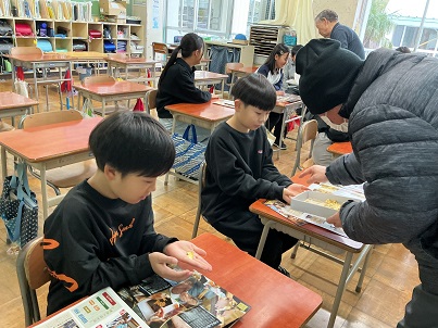 1月18日付けの南区役所だより「みなみ風」にも紹介されている「白根仏壇」の蒔絵装飾を5年生は体験しました。白根仏壇の歴史を学んだ後、手作業で作る仏壇の金具を見せてもらいました。「カシュ」(漆の代わり)で下絵を描きました。次に、金箔をパフで付け、指で擦って完成です。職人技のすばらしさを実感する体験となりました。