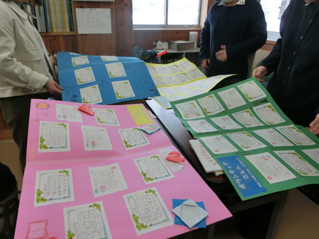1年間、児童の興味関心や季節に合わせ、図書選定と読み聞かせをしてくださったボランティアの皆様に、児童がメッセージを届けました。一人一人が気持ちを込めて丁寧に書いた手紙を、色紙に貼って手渡しました。手紙には、思い出に残った本や感想が書いてありました。児童の情操教育に貢献してくださった皆様に改めて感謝いたします。なお、メッセージは、ボランティアルームの前に掲示してあります。ご来校の際に、見てください。