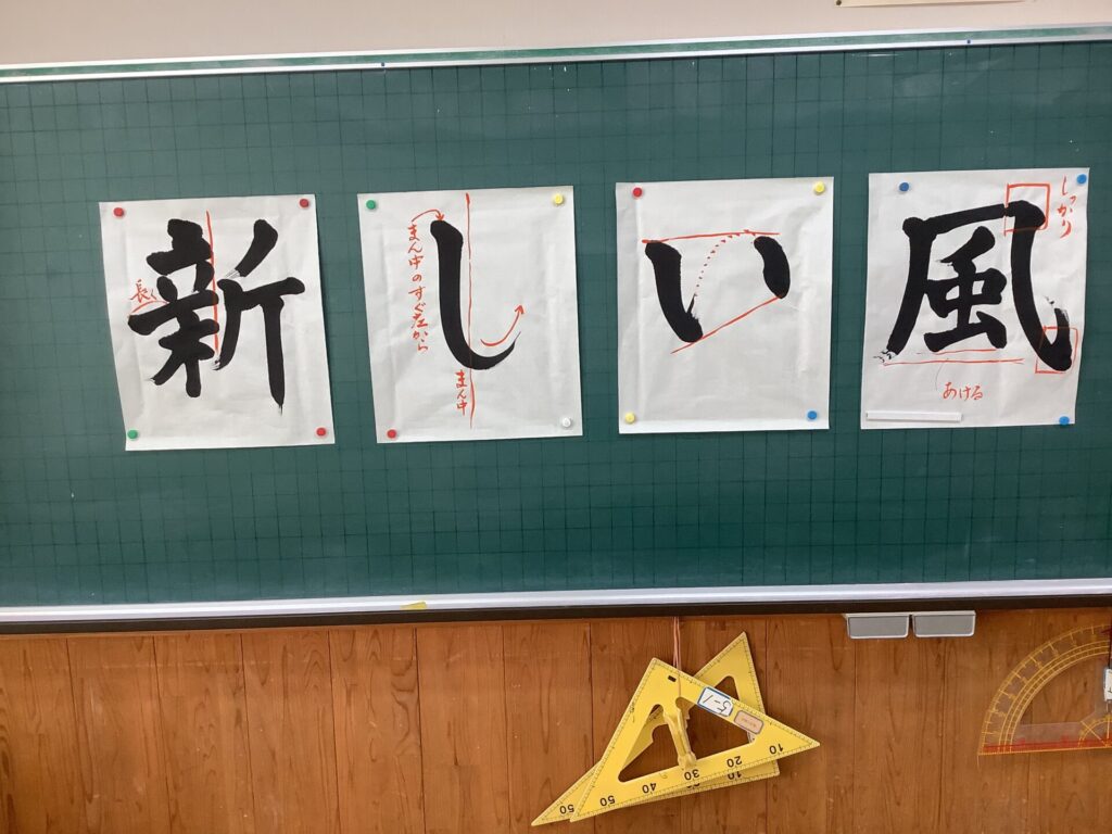 地域の高野様から、書写を教えていただきました。 一人一人、丁寧に添削をしてくださいました。 6年生は、高野さんのお手本を書く様子をよく見ていました。 見ていると、筆を持ちたくなりま …