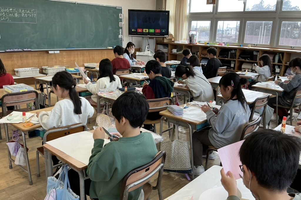 2年生が紙版画を作成していました。 模様が違う数枚の紙から、一番下書きに合う紙を選んで、切り取り、貼ります。 クジラを作成していた子は、目の形にしている紙を選び、慎重に貼っていました。 …