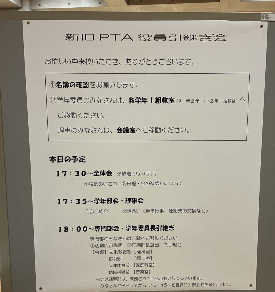 新旧役員P T A引き継ぎ会がありました。 夜遅くにお集まりくださり、感謝申し上げます。 学年部や専門部に分かれて引き継ぎを行いました。 PTAもバトンタッチです。