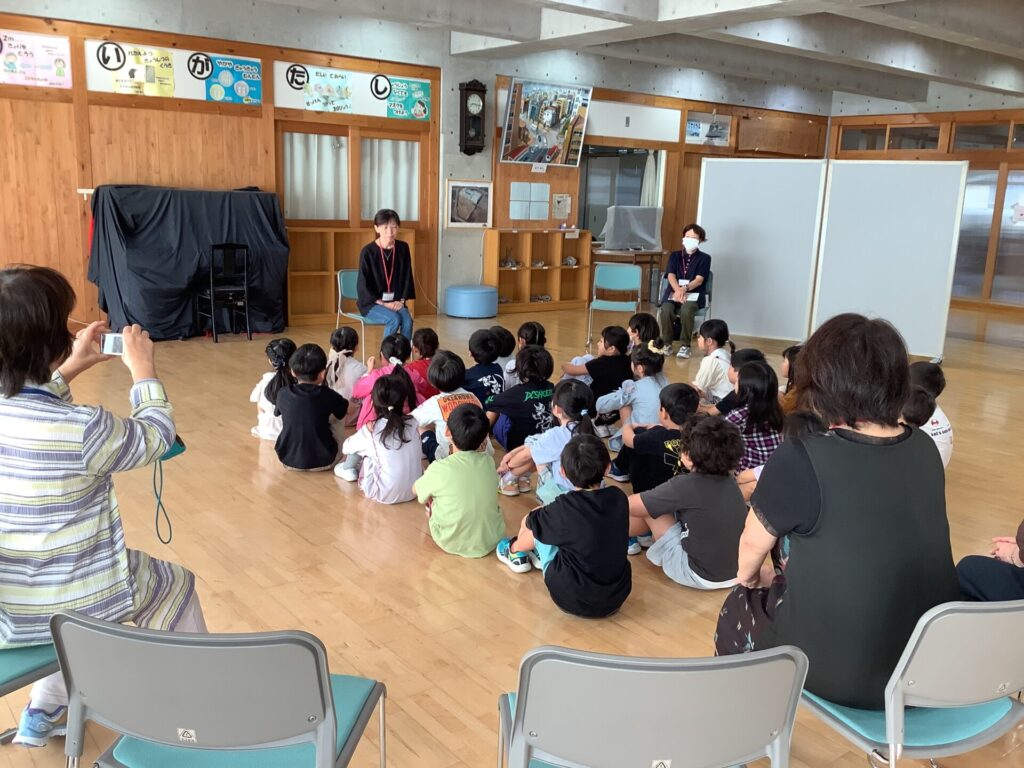「うしろにいるのだあれ」の読み聞かせでは、後ろの生きものの姿を子どもたちが目で追い、目を輝かせて聴いていました。