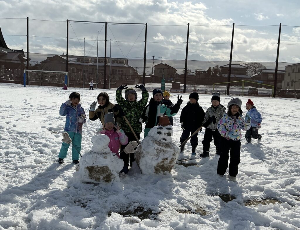 雪の上に寝転がったり、鬼ごっこをしたり、雪だるまを作ったり、雪と遊びました。
